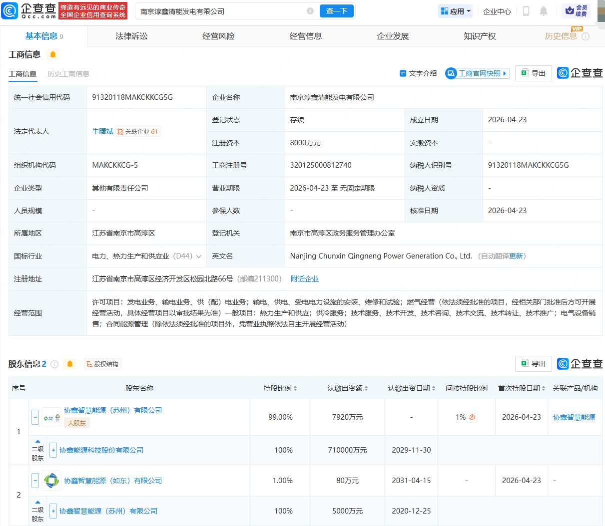 近日,南京淳鑫清能发电有限公司成立,法定代表人为牛曙斌,注册资本为8000万元,经营范围包含:发电业务、输电业务、供(配)电业务;热力生产和供应;供冷服务;电气设备销售等。企查查股权穿透显示,该公司由协鑫能科(002015)旗下协鑫智慧能源(苏州)有限公司、协鑫智慧能源(如东)有限公司共同持股。